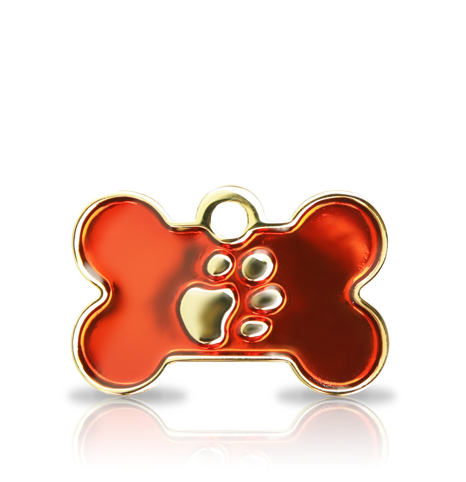 Koiran nimikyltti – Fashion kullattu punainen pieni luu 2,8 x 1,8cm tassukuvioinnilla.